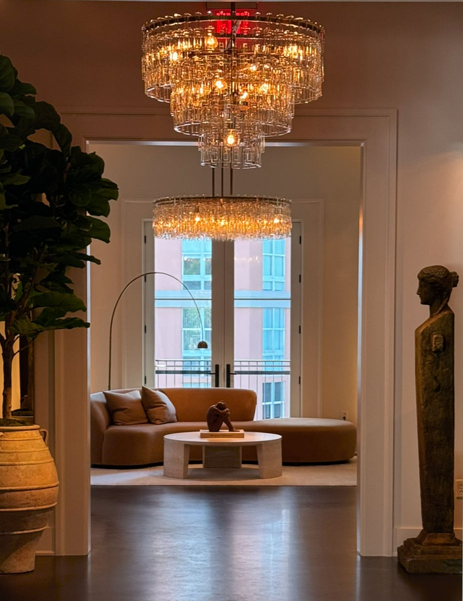 Chandeliers are used not just as lighting, but as sculptural statements—anchoring rooms and drawing the eye upward.